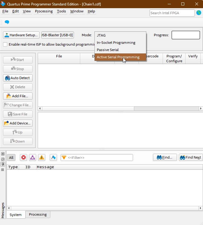 続けて、そのとなりのMode欄で「Active Serial Programming」 を選択します。